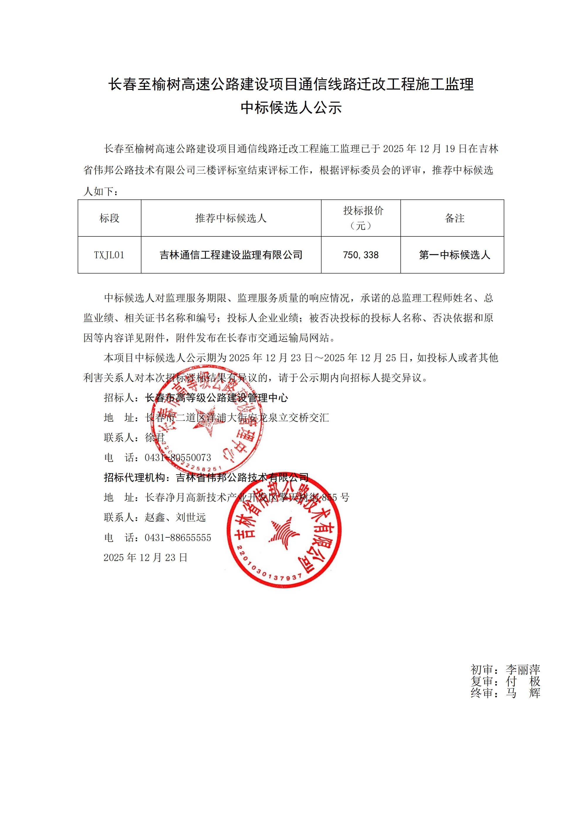 长春至榆树高速公路建设项目通信线路迁改工程施工监理中标候选人公示