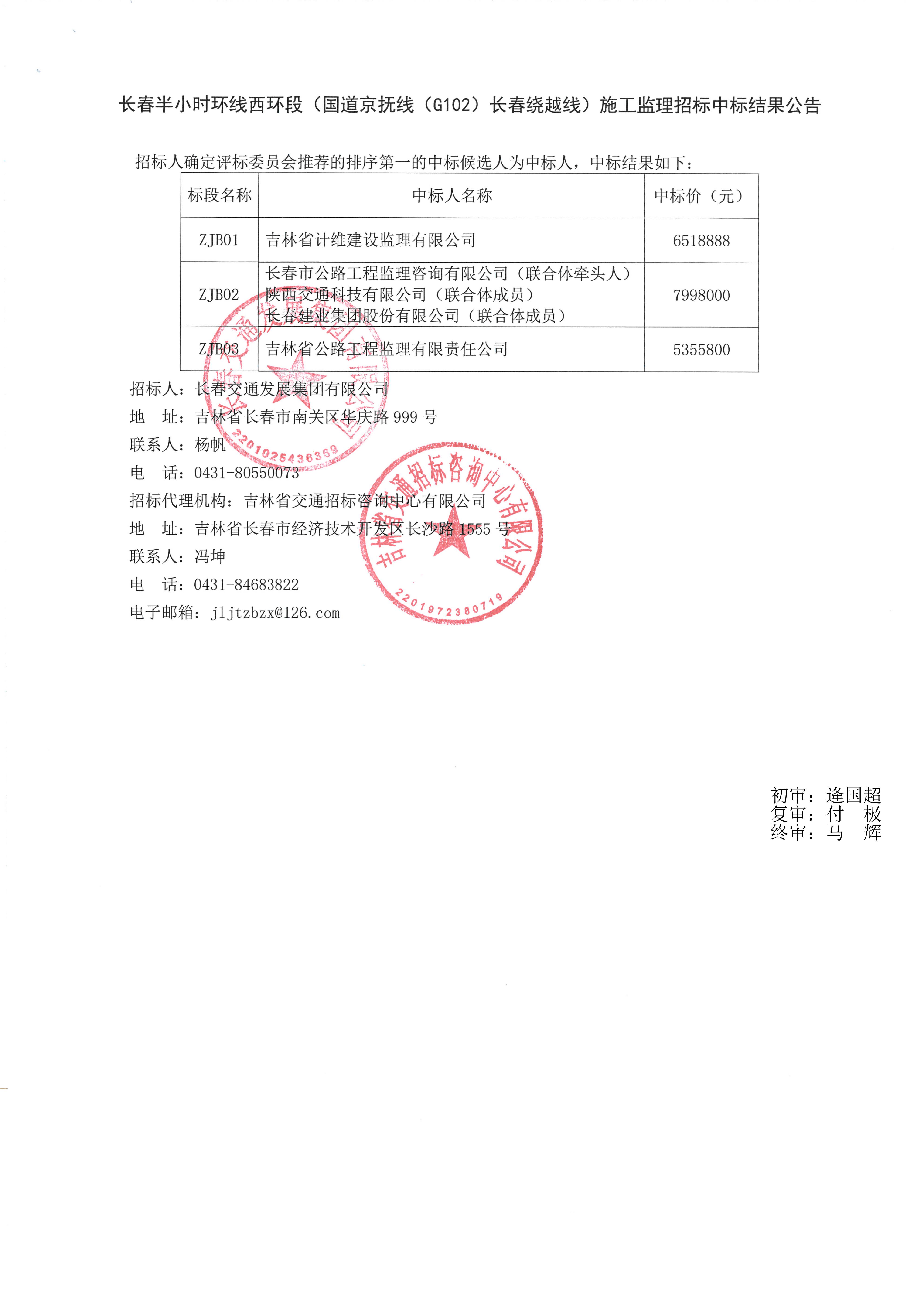 长春半小时环线西环段(国道京抚线(G102)长春绕越线)施工监理招标中标结果公告