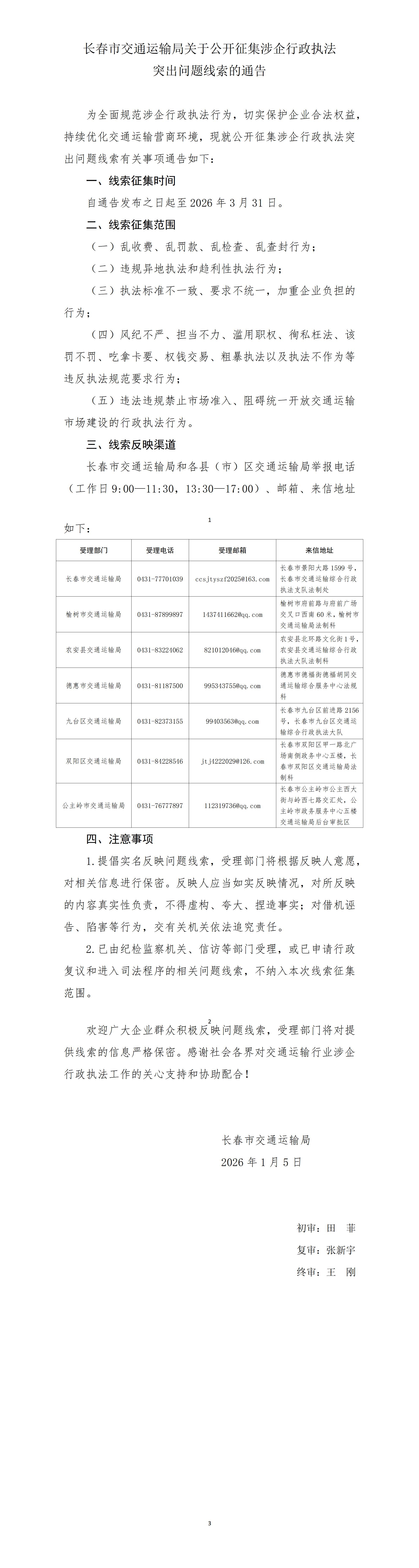 长春市交通运输局关于公开征集涉企行政执法 突出问题线索的通告