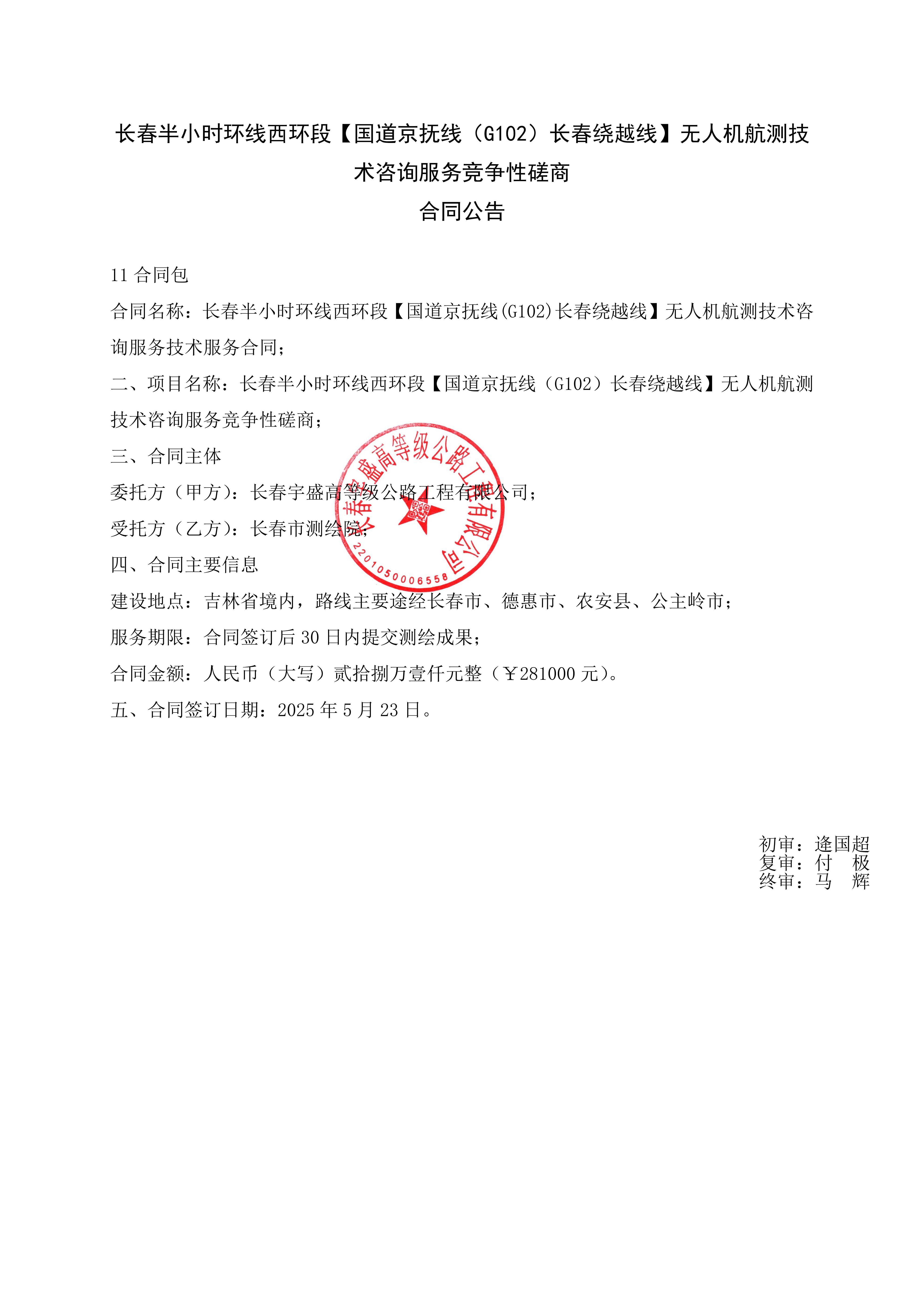 长春半小时环线西环段【国道京抚线(G102)长春绕越线】无人机航测技术咨询服务竞争性磋商合同公告