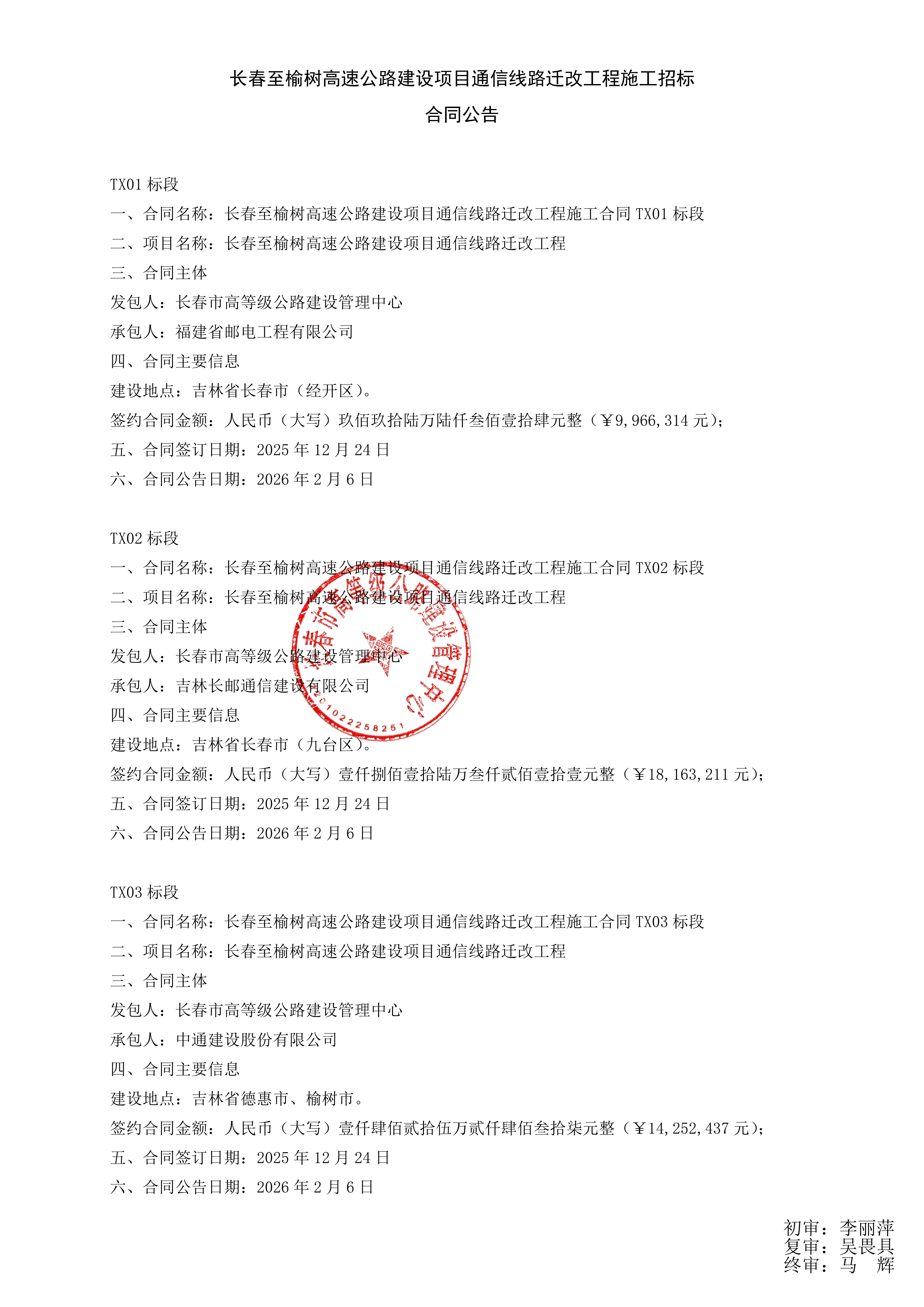 长春至榆树高速公路建设项目通信线路迁改工程施工招标合同公告