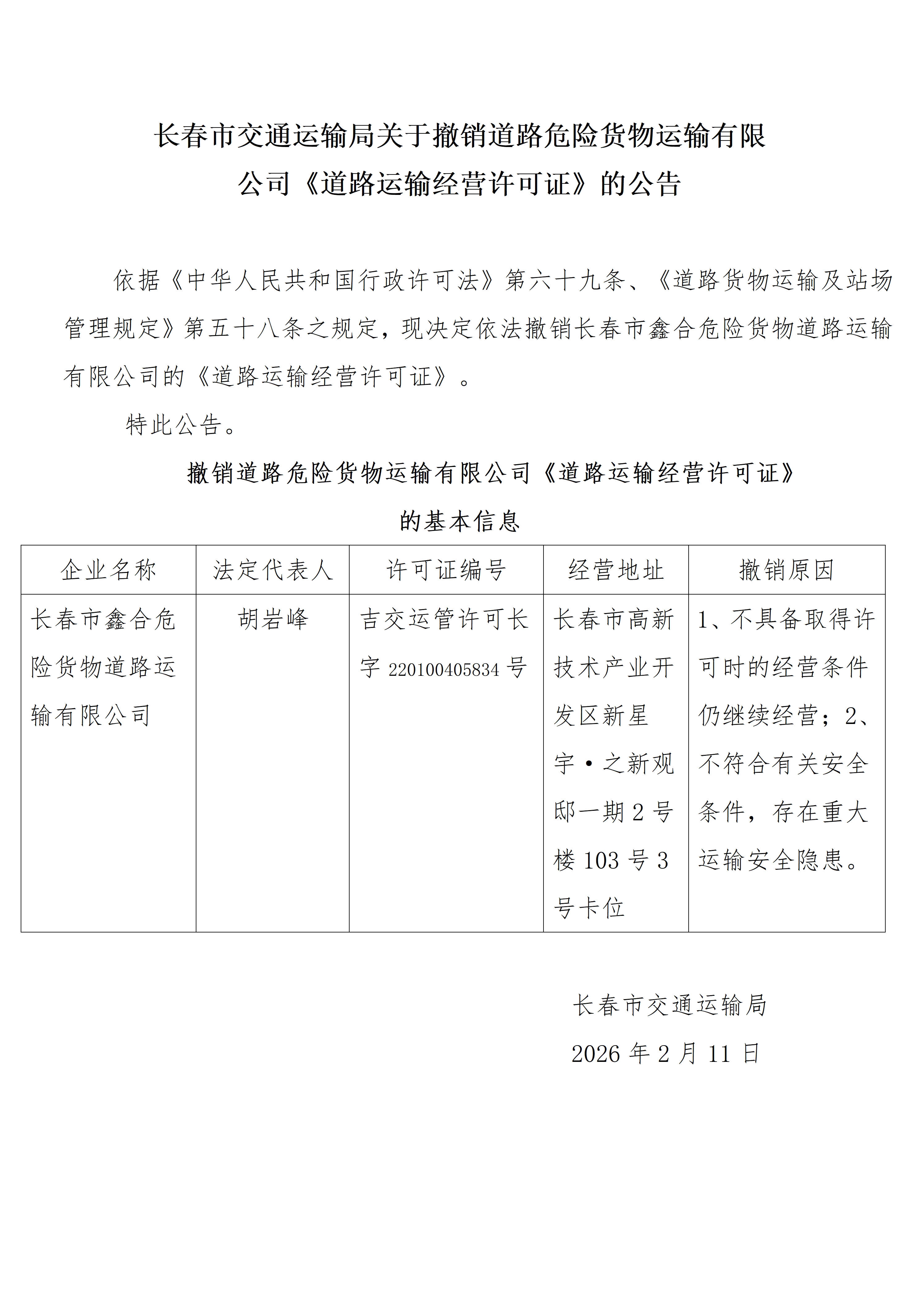长春市交通运输局关于撤销道路危险货物运输有限公司《道路运输经营许可证》的公告