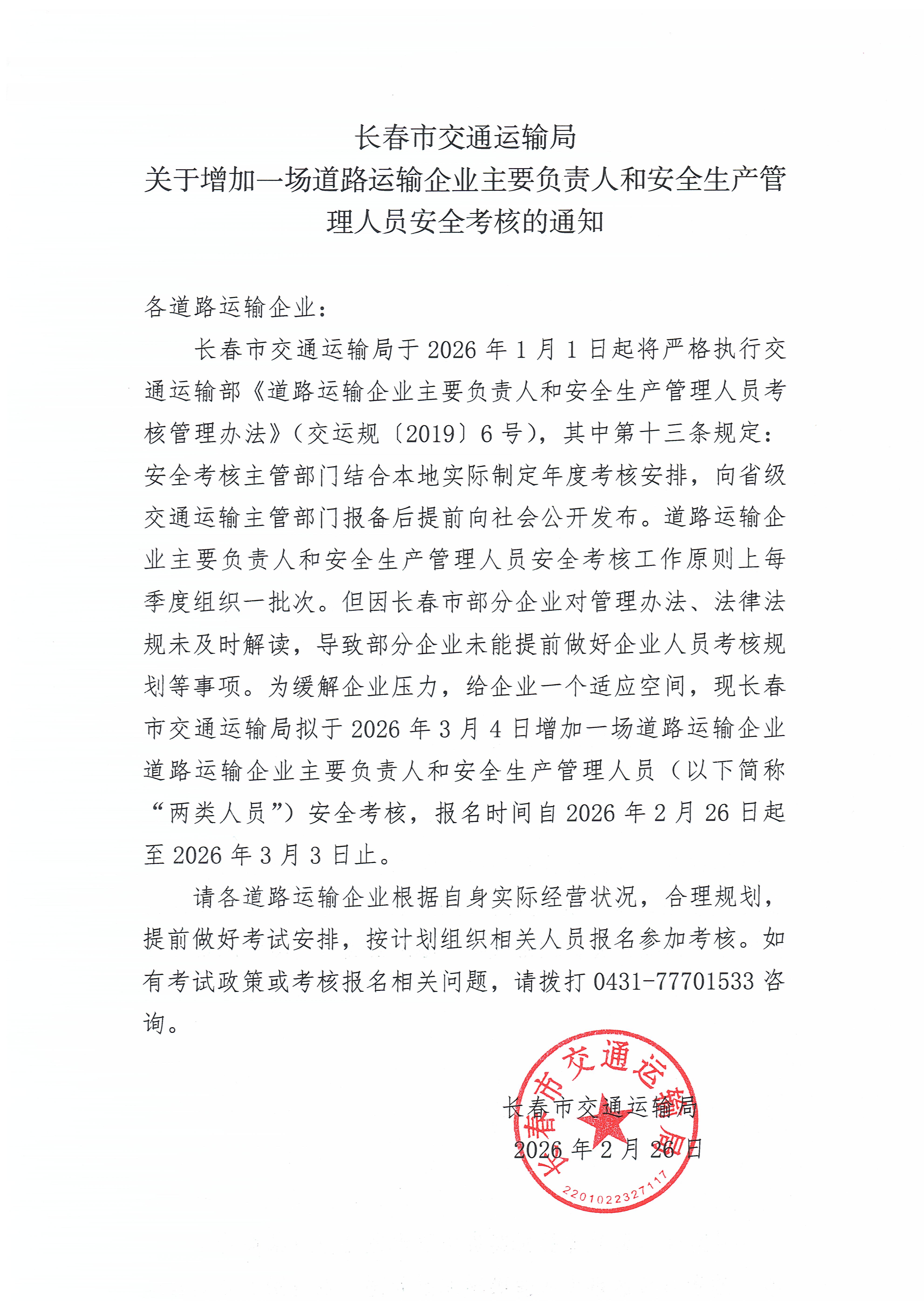 长春市交通运输局关于增加一场道路运输企业主要负责人和安全生产管理人员安全考核的通知