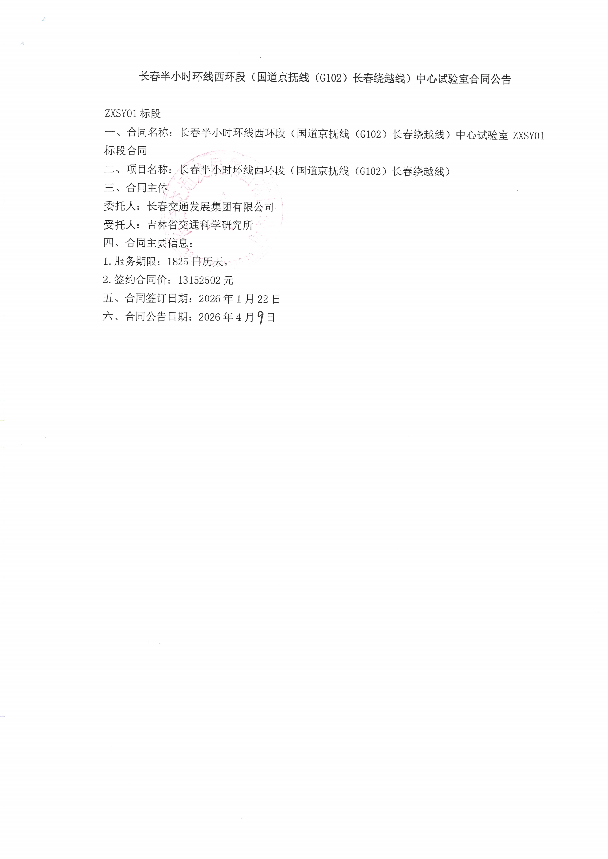 长春半小时环线西环段(国道京抚线(G102)长春绕越线)中心试验室合同公告