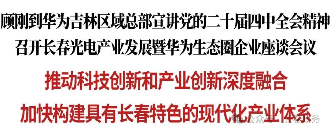 11月13日,市委宣讲团副团长、市委副书记、市长顾刚到华为吉林区域总部宣讲党的二十届四中全会精神,召开长春光电产业发展暨华为生态圈企业座谈会议。他指出,要深入学习贯彻党的二十届四中全会精神和习近平总书记在听取吉林省委和省政府工作汇报时的重要讲话精神,坚持有效市场和有为政府相结合,推动科技创新和产业创新深度融合,因地制宜发展新质生产力,加快构建具有长春特色的现代化产业体系。