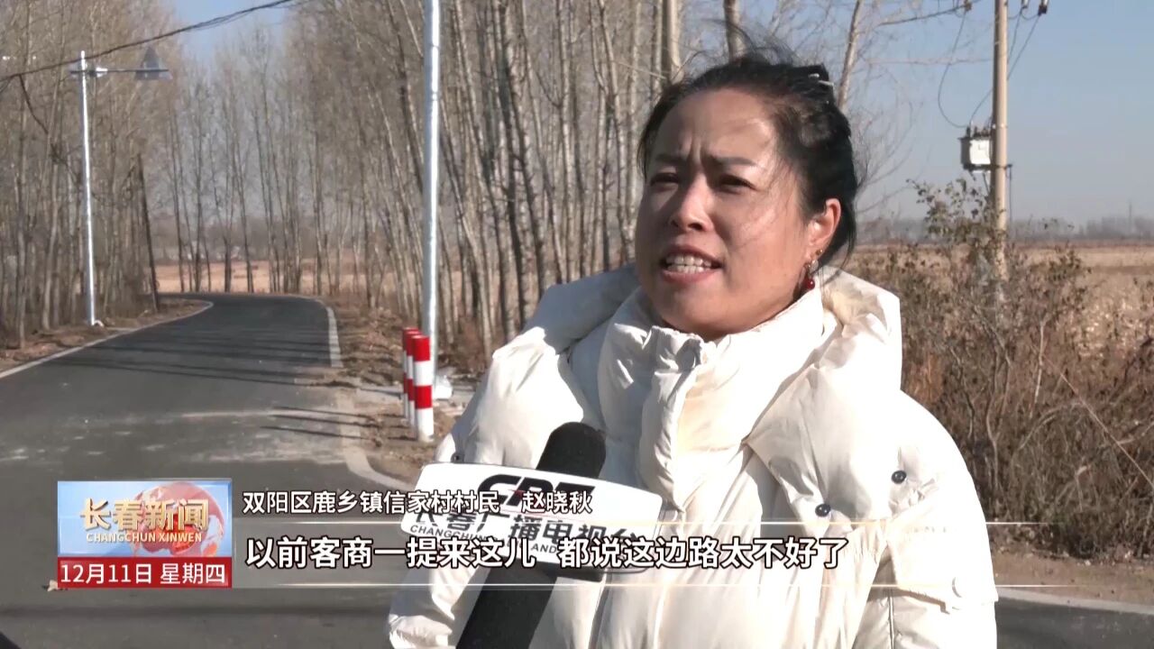 双阳区鹿乡镇信家村村民 赵晓秋:以前客商一提来这儿都说这边路太不好了,人家就不愿意来了,自从路修完了之后,就特别平坦,别管是去哪里时间都缩短了。有搞直播的,(订)单出得特别大,人家快递员有小车,也愿意来了。