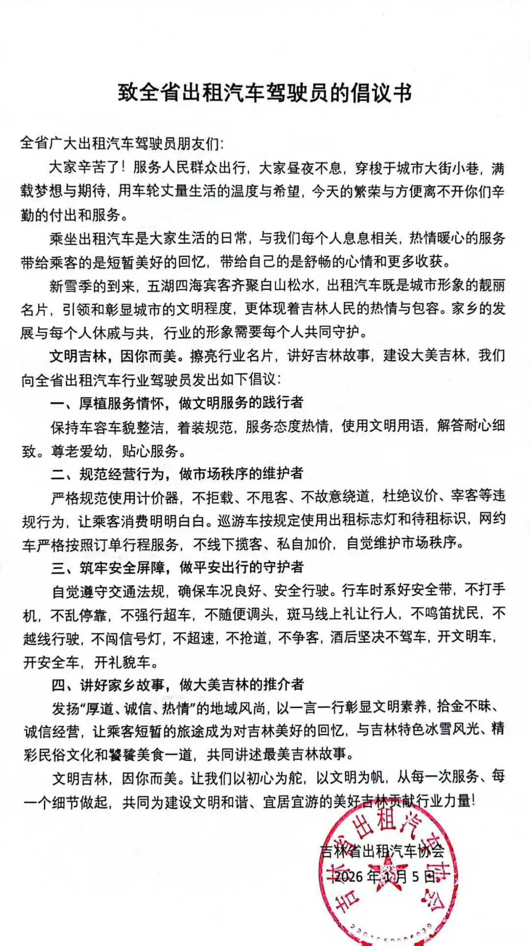 新雪季的到来,五湖四海宾客齐聚白山松水,出租汽车既是城市形象的靓丽名片,引领和彰显城市的文明程度,更体现着吉林人民的热情与包容。家乡的发展与每个人休戚与共,行业的形象需要每个人共同守护。