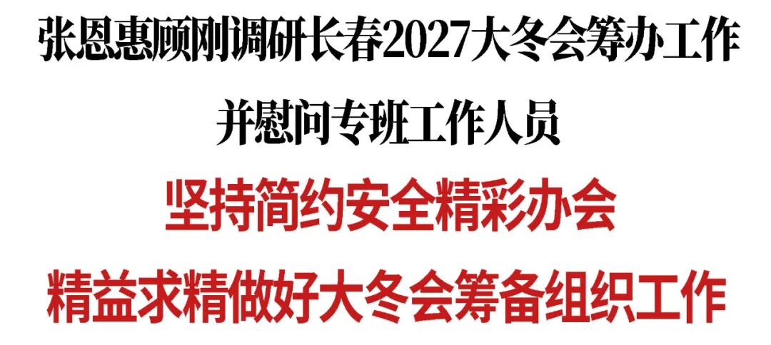 调研中,张恩惠主持召开专题会,调度听取大冬会筹办工作情况汇报。他用“开局良好、进展顺利、效果明显”充分肯定筹办工作取得的阶段性成效,强调要提高政治站位,加力推动各项筹备工作提速增效,精心做好赛事组织、接待服务、安全保障等工作,统筹推进环境美化和公共设施完善,实现“办好一次会、提升一座城”。要坚持“简约、安全、精彩”办会,厉行节约,严把工程质量关、全过程安全关,深挖汽车、电影、冰雪等独特资源优势,精心策划项目,彰显特色,展示长春青春活力之城形象。要坚持全市“一盘棋”,加强组织领导,拧紧责任链条,强化部门协作,形成工作闭环,干一项、成一项。要增强经营意识,加大市场宣传推介力度,积极拓展“赛事+”新业态,有效激活文体旅商融合消费潜力,释放赛会综合带动效应。要压紧压实赛事筹办和廉洁办赛主体责任,开展专项监督,保障赛事廉洁高效举办。