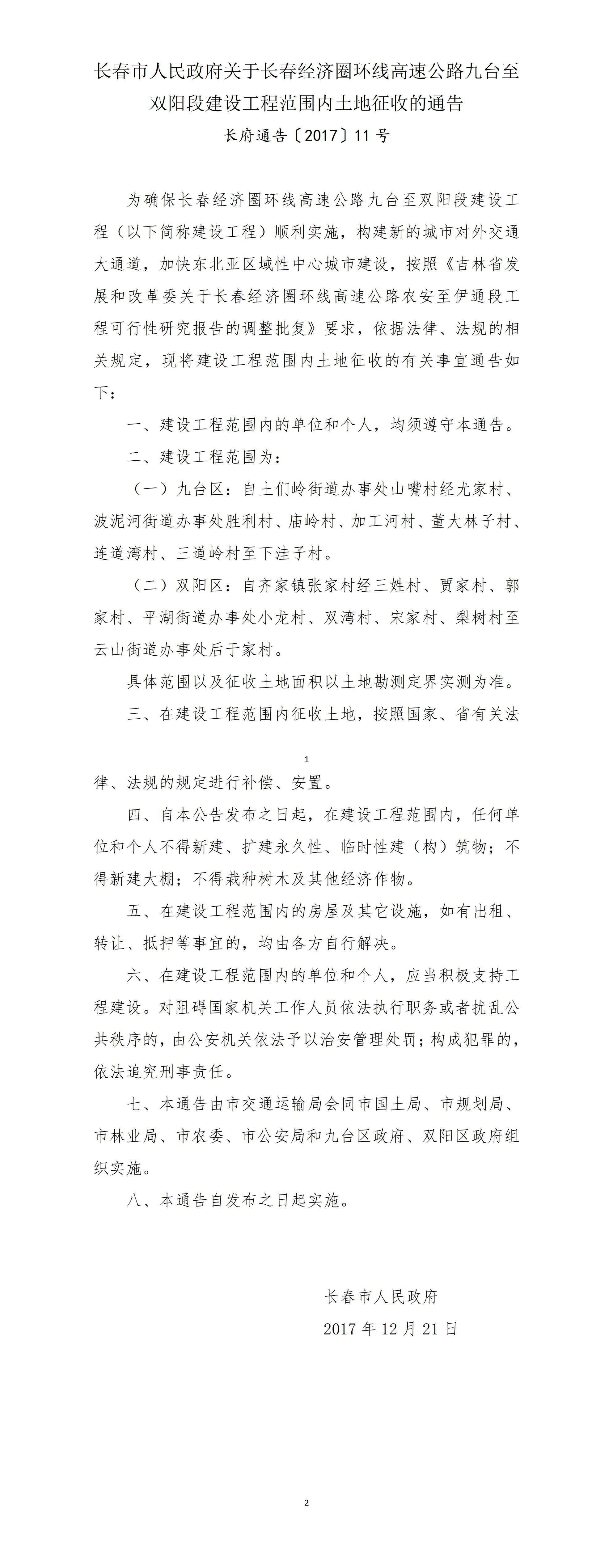 (长府通告﹝2017﹞11号)长春市人民政府关于长春经济圈环线高速公路九台至双阳段建设工程范围内土地征收的通告